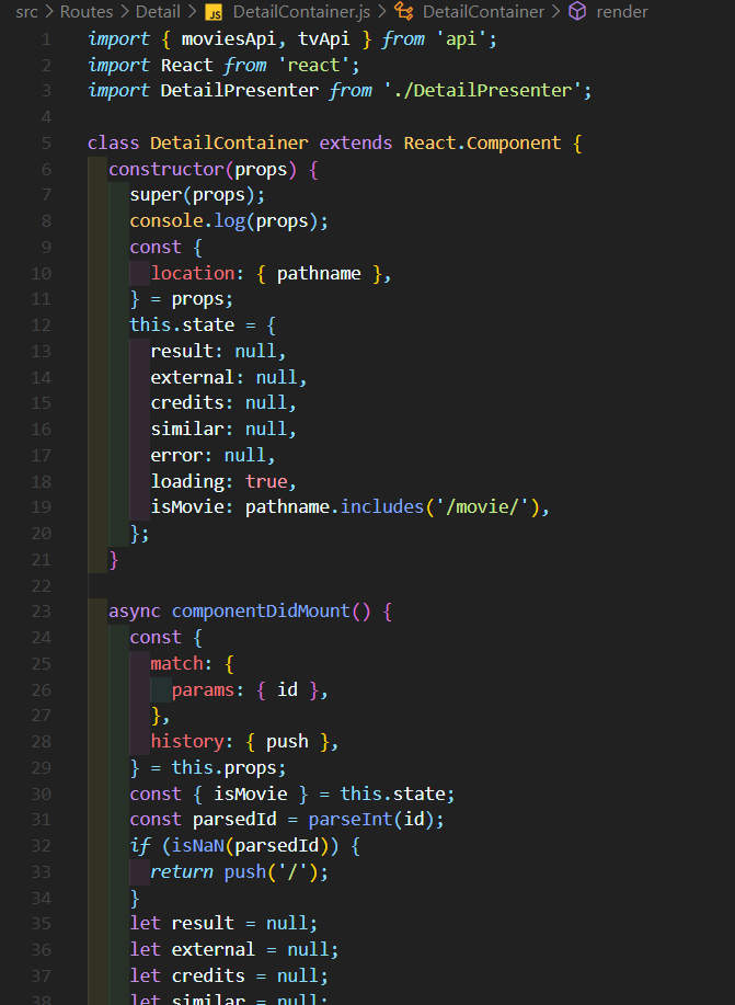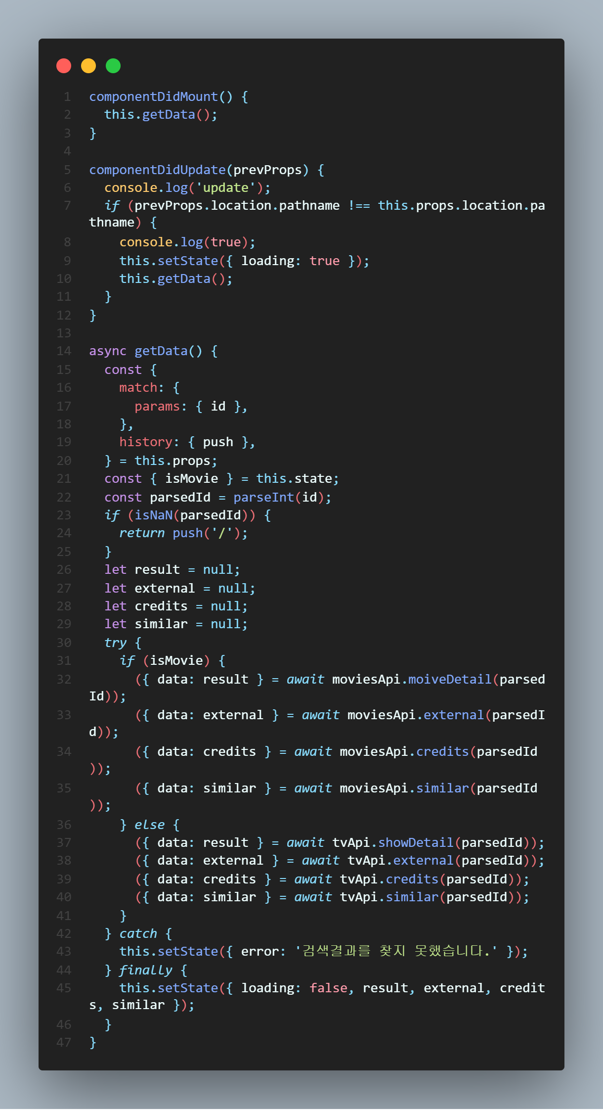 componentDidMount์ ์๋ api๋ฅผ ๋ฐ์์ค๋ ํจ์๋ฅผ componentDidUpdate์์๋ ์ฌ์ฉํ๊ธฐ ์ํด ๋ฐ๋ก ๋ถ๋ฆฌํด์คฌ๋ค.