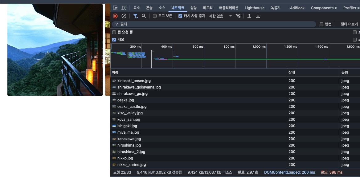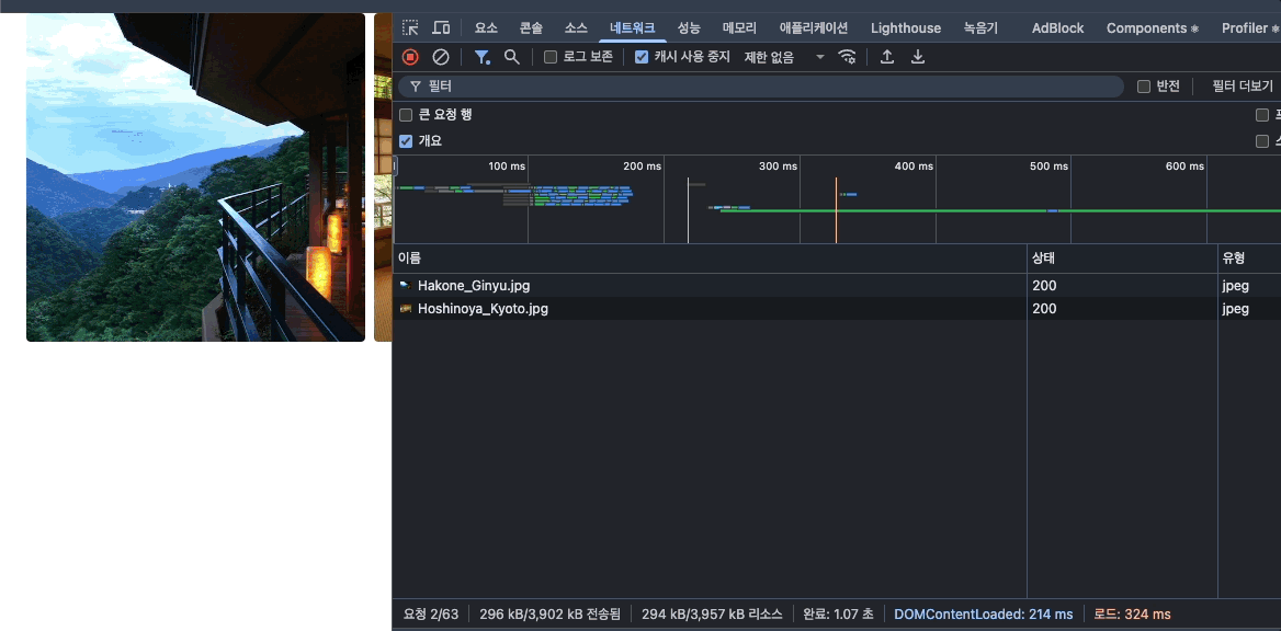 ๋คํธ์ํฌ ํญ์ ํ์ธํด๋ณด๋ฉด ์ค์ ๋ก ์ฝ 1MB ์ ๋์ ์ด๋ฏธ์ง ๋ฆฌ์์ค๋ฅผ ์์ฒญํ ๊ฒ์ ํ์ธํ ์ ์์ต๋๋ค.