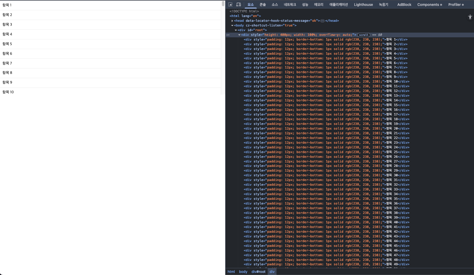 ์ฃผ์ํ ์ ์ผ๋ก๋ ์ค์ DOM์ ๊ทธ๋ ค์ง๊ธฐ ์ ์ ์คํฌ๋กค์ ๋น ๋ฅด๊ฒ ๋ด๋ฆฌ๋ฉด ํฐ ํ๋ฉด์ด ์ ๊น ๋ณด์ผ ์ ์์ด์.