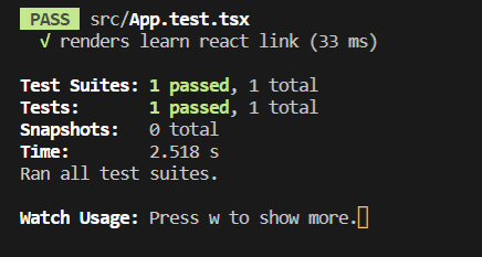 CRA typescript๋ก ํจํค์ง๋ค์ ์ค์นํ๊ณ ๋ ํ์ npm test ๋ช ๋ น์ด๋ฅผ ํตํด์ ๊ธฐ๋ณธ์ ์ผ๋ก ์์ฑ๋์ด ์๋ ํ ์คํธ ์ฝ๋๋ค์ด ์ ์คํ์ด ๋๋์ง ํ์ธ์ ํด๋ดค๋ค.