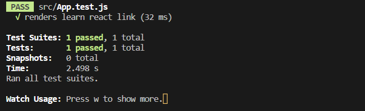 ์ค์น๊ฐ ์๋ฃ๋์ผ๋ฉด ํฐ๋ฏธ๋ ์ฐฝ์ ์ด๊ณ npm test ๋ช ๋ น์ด๋ฅผ ์ ๋ ฅํด ์คํํ๋ค.