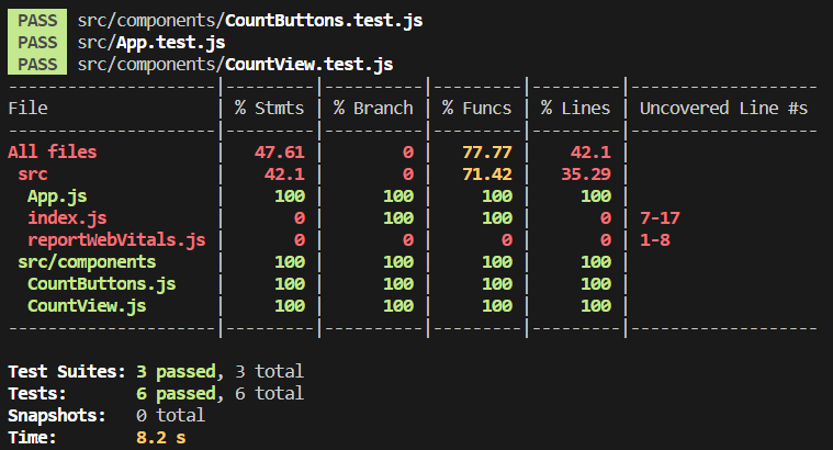์ง๊ธ๊น์ง ์์ฑํ App.js, CountButtons.js, CountView.js ํ์ผ๋ค์ ๋ํ ํ ์คํธ coverage๊ฐ 100%์์ ํ์ธํ ์ ์๋ค.