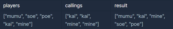 ์ ์๋ค์ ์ด๋ฆ์ด 1๋ฑ๋ถํฐ ํ์ฌ ๋ฑ์ ์์๋๋ก ๋ด๊ธด ๋ฌธ์์ด ๋ฐฐ์ด players์ ํด์ค์ง์ด ๋ถ๋ฅธ ์ด๋ฆ์ ๋ด์ ๋ฌธ์์ด ๋ฐฐ์ด callings๊ฐ ๋งค๊ฐ๋ณ์๋ก ์ฃผ์ด์ง ๋, ๊ฒฝ์ฃผ๊ฐ ๋๋ฌ์ ๋ ์ ์๋ค์ ์ด๋ฆ์ 1๋ฑ๋ถํฐ ๋ฑ์ ์์๋๋ก ๋ฐฐ์ด์ ๋ด์ return ํ๋ solution ํจ์๋ฅผ ์์ฑํด์ฃผ์ธ์.