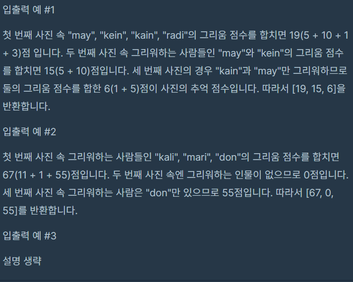 ์ฌ์ง๋ค์ ๋ณด๋ฉฐ ์ถ์ต์ ์ ์ด ์๋ ๋ฃจ๋ ์ฌ์ง๋ณ๋ก ์ถ์ต ์ ์๋ฅผ ๋งค๊ธธ๋ ค๊ณ ํฉ๋๋ค. ์ฌ์ง ์์ ๋์ค๋ ์ธ๋ฌผ์ ๊ทธ๋ฆฌ์ ์ ์๋ฅผ ๋ชจ๋ ํฉ์ฐํ ๊ฐ์ด ํด๋น ์ฌ์ง์ ์ถ์ต ์ ์๊ฐ ๋ฉ๋๋ค. ์๋ฅผ ๋ค์ด ์ฌ์ง ์ ์ธ๋ฌผ์ ์ด๋ฆ์ด ["may", "kein", "kain"]์ด๊ณ ๊ฐ ์ธ๋ฌผ์ ๊ทธ๋ฆฌ์ ์ ์๊ฐ [5์ , 10์ , 1์ ]์ผ ๋ ํด๋น ์ฌ์ง์ ์ถ์ต ์ ์๋ 16(5 + 10 + 1)์ ์ด ๋ฉ๋๋ค. ๋ค๋ฅธ ์ฌ์ง ์ ์ธ๋ฌผ์ ์ด๋ฆ์ด ["kali", "mari", "don", "tony"]์ด๊ณ ["kali", "mari", "don"]์ ๊ทธ๋ฆฌ์ ์ ์๊ฐ ๊ฐ๊ฐ [11์ , 1์ , 55์ ]]์ด๊ณ , "tony"๋ ๊ทธ๋ฆฌ์ ์ ์๊ฐ ์์ ๋, ์ด ์ฌ์ง์ ์ถ์ต ์ ์๋ 3๋ช ์ ๊ทธ๋ฆฌ์ ์ ์๋ฅผ ํฉํ 67(11 + 1 + 55)์ ์ ๋๋ค.