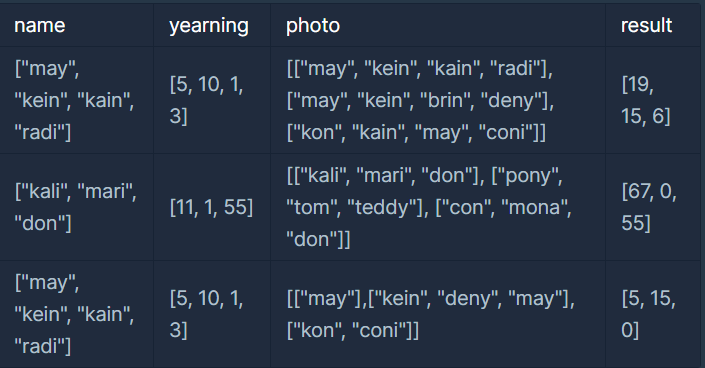 ๊ทธ๋ฆฌ์ํ๋ ์ฌ๋์ ์ด๋ฆ์ ๋ด์ ๋ฌธ์์ด ๋ฐฐ์ด name, ๊ฐ ์ฌ๋๋ณ ๊ทธ๋ฆฌ์ ์ ์๋ฅผ ๋ด์ ์ ์ ๋ฐฐ์ด yearning, ๊ฐ ์ฌ์ง์ ์ฐํ ์ธ๋ฌผ์ ์ด๋ฆ์ ๋ด์ ์ด์ฐจ์ ๋ฌธ์์ด ๋ฐฐ์ด photo๊ฐ ๋งค๊ฐ๋ณ์๋ก ์ฃผ์ด์ง ๋, ์ฌ์ง๋ค์ ์ถ์ต ์ ์๋ฅผ photo์ ์ฃผ์ด์ง ์์๋๋ก ๋ฐฐ์ด์ ๋ด์ returnํ๋ solution ํจ์๋ฅผ ์์ฑํด์ฃผ์ธ์.